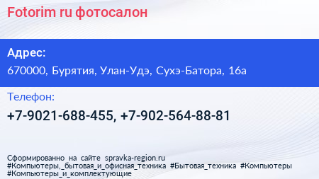Fotorim.ru, фотосалон по адресу 670000, Бурятия, Улан-Удэ, Сухэ-Батора, 16а в дальнейшем Организация, размещена в следующих категориях: