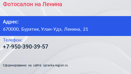 Фотосалон на Ленина по адресу 670000, Бурятия, Улан-Удэ, Ленина, 21 в дальнейшем Организация, размещена в следующих категориях: