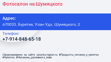 Фотосалон на Шумяцкого по адресу 670033, Бурятия, Улан-Удэ, Шумяцкого, 2 в дальнейшем Организация, размещена в следующих категориях: