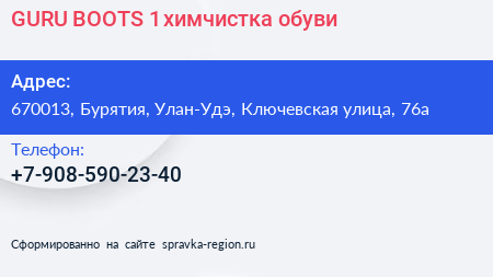 GURU BOOTS #1, химчистка обуви по адресу 670013, Бурятия, Улан-Удэ, Ключевская улица, 76а в дальнейшем Организация, размещена в следующих категориях: