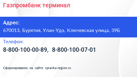 Газпромбанк, терминал по адресу 670013, Бурятия, Улан-Удэ, Ключевская улица, 39Б в дальнейшем Организация, размещена в следующих категориях:
