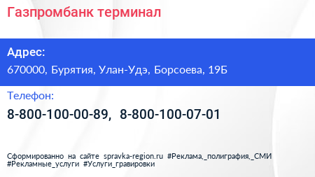 Газпромбанк, терминал по адресу 670000, Бурятия, Улан-Удэ, Борсоева, 19Б в дальнейшем Организация, размещена в следующих категориях: