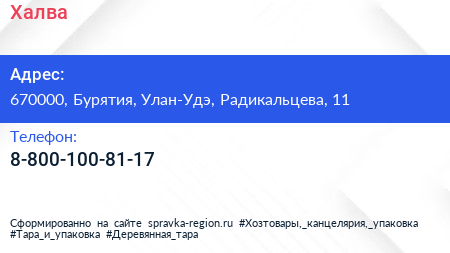 Халва по адресу 670000, Бурятия, Улан-Удэ, Радикальцева, 11 в дальнейшем Организация, размещена в следующих категориях: