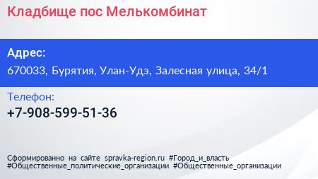 Кладбище, пос. Мелькомбинат по адресу 670033, Бурятия, Улан-Удэ, Залесная улица, 34/1 в дальнейшем Организация, размещена в следующих категориях: