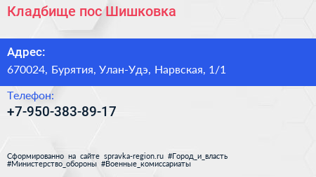 Кладбище, пос. Шишковка по адресу 670024, Бурятия, Улан-Удэ, Нарвская, 1/1 в дальнейшем Организация, размещена в следующих категориях: