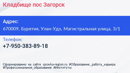 Кладбище, пос. Загорск по адресу 670009, Бурятия, Улан-Удэ, Магистральная улица, 3/1 в дальнейшем Организация, размещена в следующих категориях: