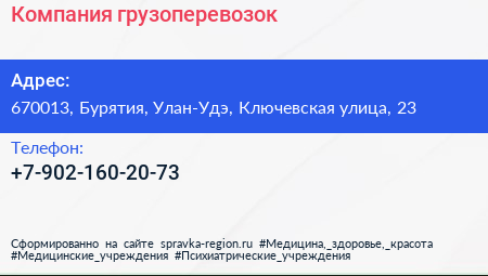 Компания грузоперевозок по адресу 670013, Бурятия, Улан-Удэ, Ключевская улица, 23 в дальнейшем Организация, размещена в следующих категориях: