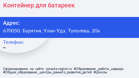 Контейнер для батареек по адресу 670050, Бурятия, Улан-Удэ, Туполева, 20а в дальнейшем Организация, размещена в следующих категориях: