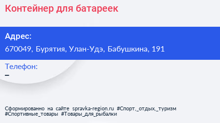 Контейнер для батареек по адресу 670049, Бурятия, Улан-Удэ, Бабушкина, 191 в дальнейшем Организация, размещена в следующих категориях: