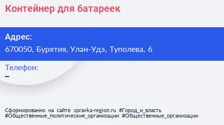 Контейнер для батареек по адресу 670050, Бурятия, Улан-Удэ, Туполева, 6 в дальнейшем Организация, размещена в следующих категориях: