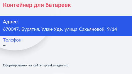 Контейнер для батареек по адресу 670047, Бурятия, Улан-Удэ, улица Сахьяновой, 9/14 в дальнейшем Организация, размещена в следующих категориях: