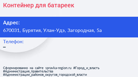 Контейнер для батареек по адресу 670031, Бурятия, Улан-Удэ, Загородная, 5а в дальнейшем Организация, размещена в следующих категориях: