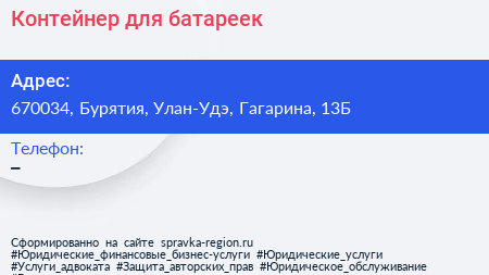 Контейнер для батареек по адресу 670034, Бурятия, Улан-Удэ, Гагарина, 13Б в дальнейшем Организация, размещена в следующих категориях: