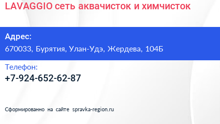 LAVAGGIO, сеть аквачисток и химчисток по адресу 670033, Бурятия, Улан-Удэ, Жердева, 104Б в дальнейшем Организация, размещена в следующих категориях: