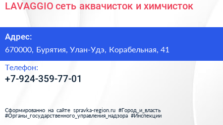 LAVAGGIO, сеть аквачисток и химчисток по адресу 670000, Бурятия, Улан-Удэ, Корабельная, 41 в дальнейшем Организация, размещена в следующих категориях:
