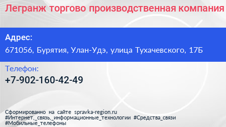 Легранж, торгово-производственная компания по адресу 671056, Бурятия, Улан-Удэ, улица Тухачевского, 17Б в дальнейшем Организация, размещена в следующих категориях: