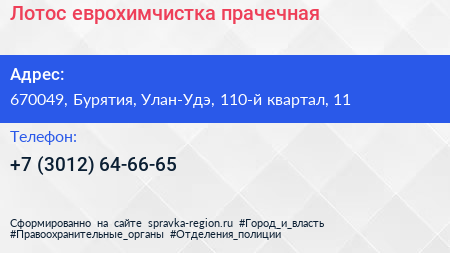 Лотос, еврохимчистка-прачечная по адресу 670049, Бурятия, Улан-Удэ, 110-й квартал, 11 в дальнейшем Организация, размещена в следующих категориях: