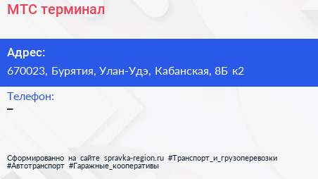 МТС, терминал по адресу 670023, Бурятия, Улан-Удэ, Кабанская, 8Б к2 в дальнейшем Организация, размещена в следующих категориях: