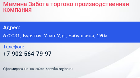 Мамина Забота, торгово-производственная компания по адресу 670031, Бурятия, Улан-Удэ, Бабушкина, 190а в дальнейшем Организация, размещена в следующих категориях: