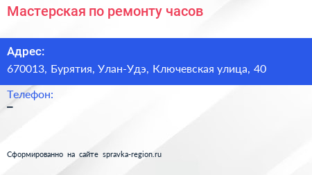 Мастерская по ремонту часов по адресу 670013, Бурятия, Улан-Удэ, Ключевская улица, 40 в дальнейшем Организация, размещена в следующих категориях: