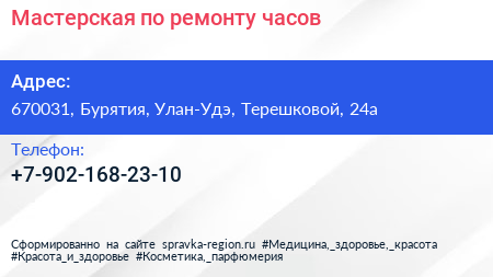 Мастерская по ремонту часов по адресу 670031, Бурятия, Улан-Удэ, Терешковой, 24а в дальнейшем Организация, размещена в следующих категориях: