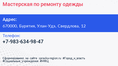 Мастерская по ремонту одежды по адресу 670000, Бурятия, Улан-Удэ, Свердлова, 12 в дальнейшем Организация, размещена в следующих категориях: