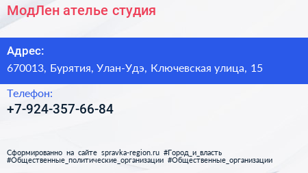 МодЛен, ателье-студия по адресу 670013, Бурятия, Улан-Удэ, Ключевская улица, 15 в дальнейшем Организация, размещена в следующих категориях: