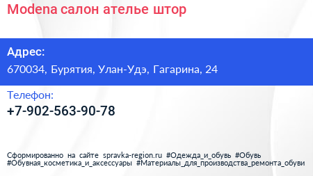 Modena, салон-ателье штор по адресу 670034, Бурятия, Улан-Удэ, Гагарина, 24 в дальнейшем Организация, размещена в следующих категориях: