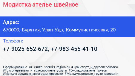 Модистка, ателье швейное по адресу 670000, Бурятия, Улан-Удэ, Коммунистическая, 20 в дальнейшем Организация, размещена в следующих категориях: