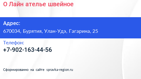 О-Лайн, ателье швейное по адресу 670034, Бурятия, Улан-Удэ, Гагарина, 25 в дальнейшем Организация, размещена в следующих категориях: