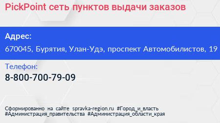 PickPoint, сеть пунктов выдачи заказов по адресу 670045, Бурятия, Улан-Удэ, проспект Автомобилистов, 19 в дальнейшем Организация, размещена в следующих категориях: