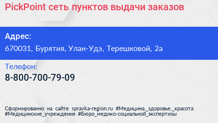 PickPoint, сеть пунктов выдачи заказов по адресу 670031, Бурятия, Улан-Удэ, Терешковой, 2а в дальнейшем Организация, размещена в следующих категориях: