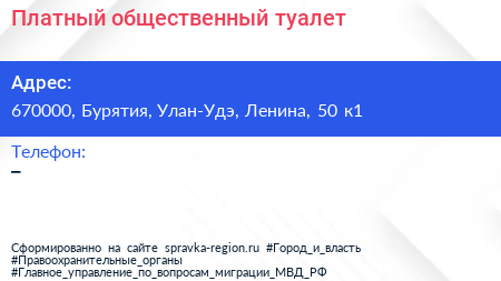 Платный общественный туалет по адресу 670000, Бурятия, Улан-Удэ, Ленина, 50 к1 в дальнейшем Организация, размещена в следующих категориях: