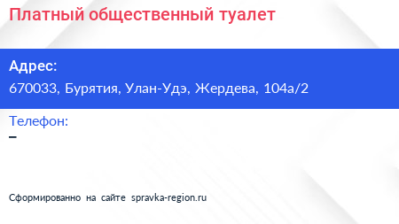 Платный общественный туалет по адресу 670033, Бурятия, Улан-Удэ, Жердева, 104а/2 в дальнейшем Организация, размещена в следующих категориях: