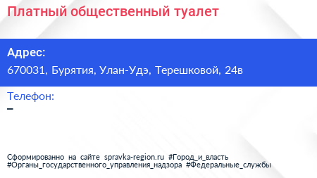 Платный общественный туалет по адресу 670031, Бурятия, Улан-Удэ, Терешковой, 24в в дальнейшем Организация, размещена в следующих категориях: