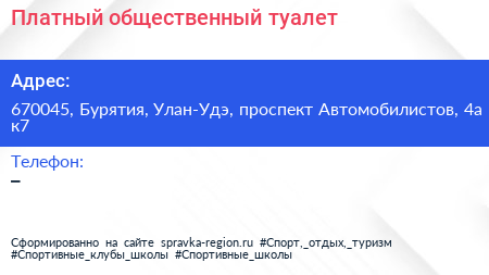 Платный общественный туалет по адресу 670045, Бурятия, Улан-Удэ, проспект Автомобилистов, 4а к7 в дальнейшем Организация, размещена в следующих категориях: