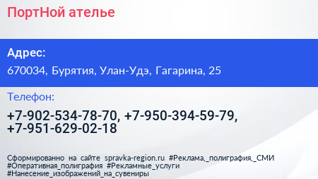 ПортНой, ателье по адресу 670034, Бурятия, Улан-Удэ, Гагарина, 25 в дальнейшем Организация, размещена в следующих категориях: