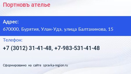 Портновъ, ателье по адресу 670000, Бурятия, Улан-Удэ, улица Балтахинова, 15 в дальнейшем Организация, размещена в следующих категориях: