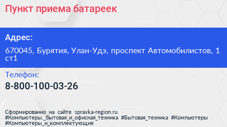 Пункт приема батареек по адресу 670045, Бурятия, Улан-Удэ, проспект Автомобилистов, 1 ст1 в дальнейшем Организация, размещена в следующих категориях: