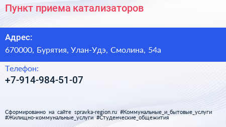 Пункт приема катализаторов по адресу 670000, Бурятия, Улан-Удэ, Смолина, 54а в дальнейшем Организация, размещена в следующих категориях: