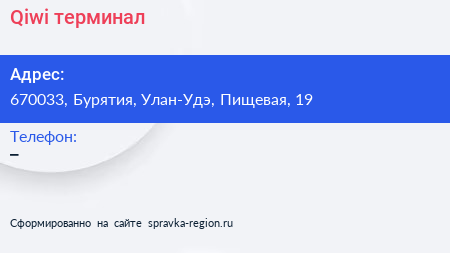 Qiwi, терминал по адресу 670033, Бурятия, Улан-Удэ, Пищевая, 19 в дальнейшем Организация, размещена в следующих категориях: