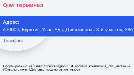 Qiwi, терминал по адресу 670004, Бурятия, Улан-Удэ, Дивизионная 3-й участок, 286 в дальнейшем Организация, размещена в следующих категориях: