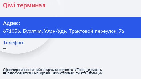 Qiwi, терминал по адресу 671056, Бурятия, Улан-Удэ, Трактовой переулок, 7а в дальнейшем Организация, размещена в следующих категориях: