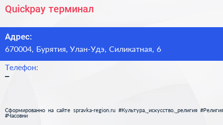 Quickpay, терминал по адресу 670004, Бурятия, Улан-Удэ, Силикатная, 6 в дальнейшем Организация, размещена в следующих категориях: