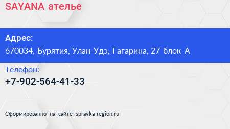 SAYANA, ателье по адресу 670034, Бурятия, Улан-Удэ, Гагарина, 27 блок А в дальнейшем Организация, размещена в следующих категориях: