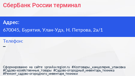 СберБанк России, терминал по адресу 670045, Бурятия, Улан-Удэ, Н. Петрова, 2а/1 в дальнейшем Организация, размещена в следующих категориях: