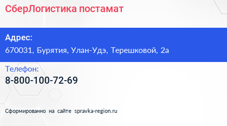 СберЛогистика, постамат по адресу 670031, Бурятия, Улан-Удэ, Терешковой, 2а в дальнейшем Организация, размещена в следующих категориях: