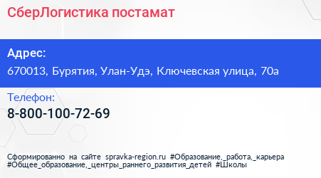 СберЛогистика, постамат по адресу 670013, Бурятия, Улан-Удэ, Ключевская улица, 70а в дальнейшем Организация, размещена в следующих категориях: