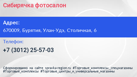 Сибирячка, фотосалон по адресу 670009, Бурятия, Улан-Удэ, Столичная, 6 в дальнейшем Организация, размещена в следующих категориях: