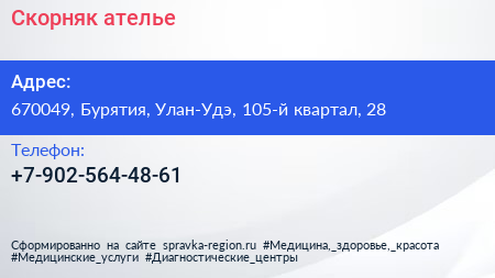 Скорняк, ателье по адресу 670049, Бурятия, Улан-Удэ, 105-й квартал, 28 в дальнейшем Организация, размещена в следующих категориях: